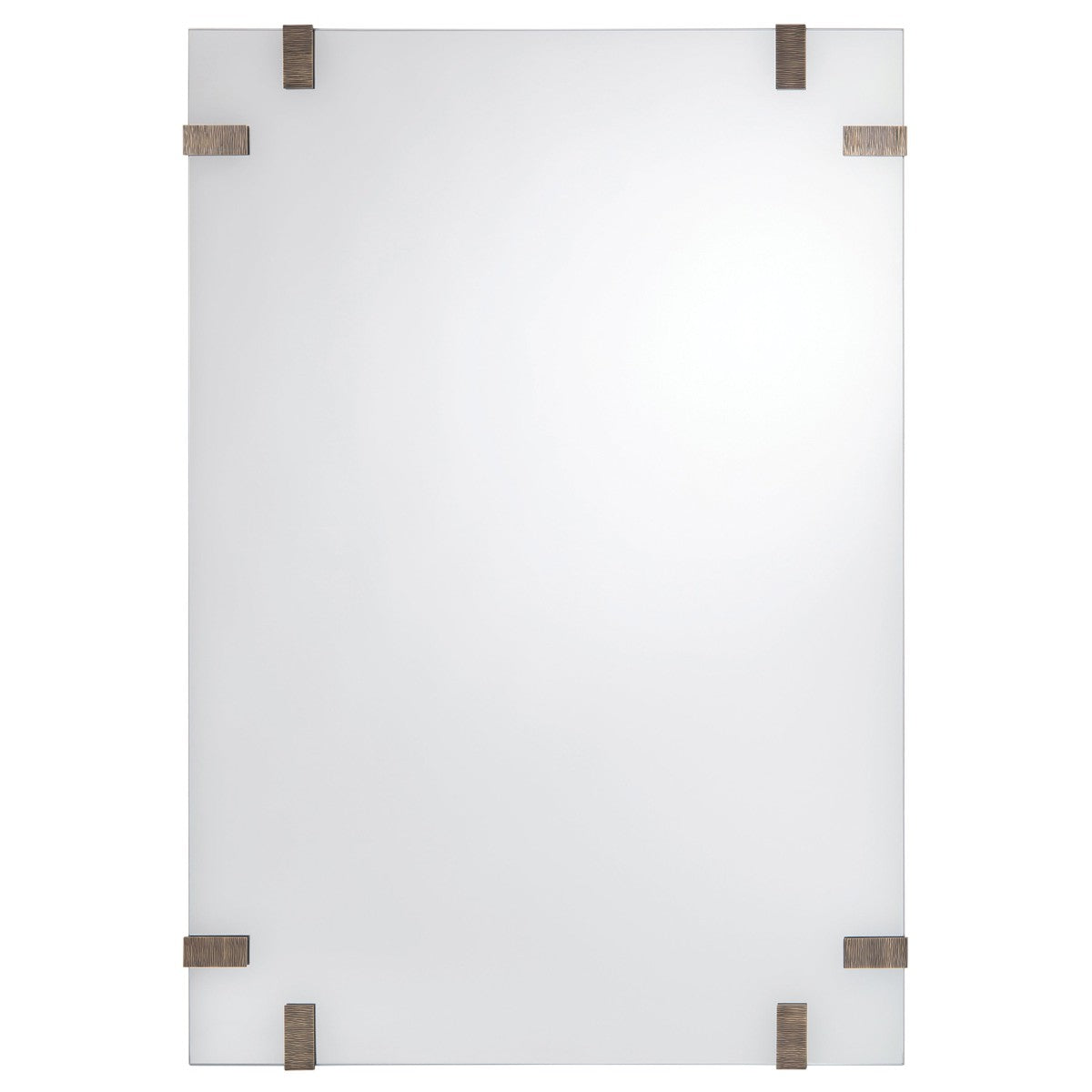 Description: A simple clean modern mirror on a silver leaf edged mount. A set of eight cast brass and textured brackets complete this simple but sophisticated design.