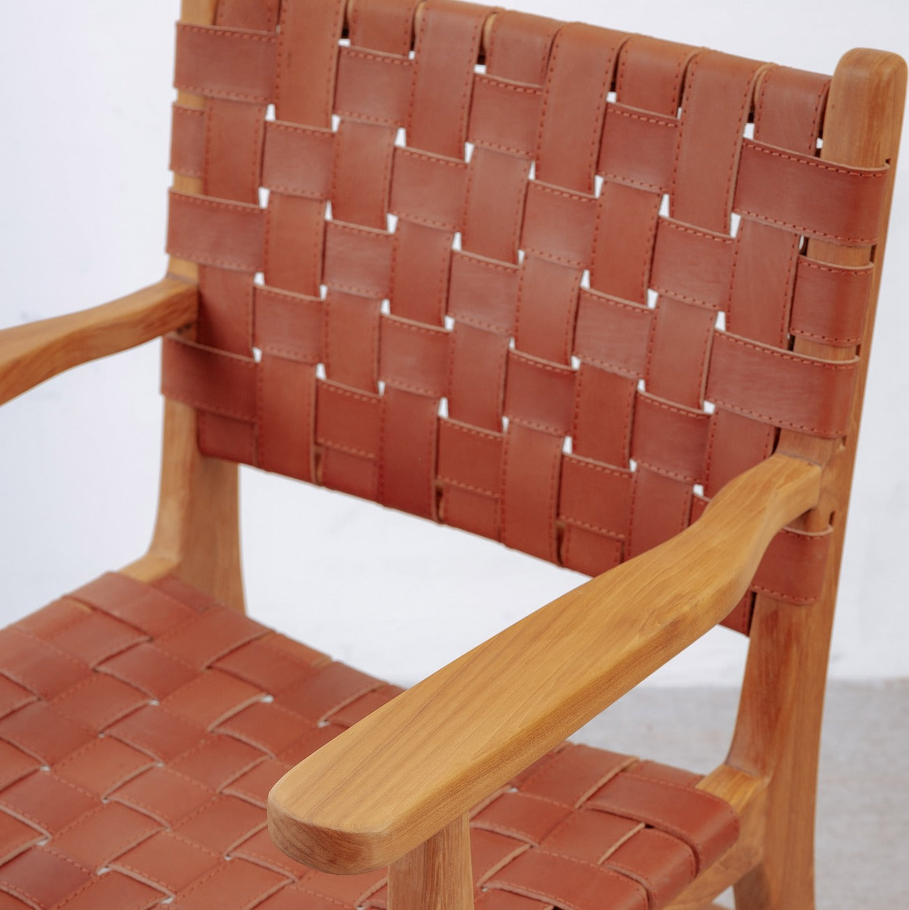 This handsome arm chair is the perfect addition to modern and contemporary style spaces alike. A sturdy teak frame provides ample support for the woven leather strap seat and back. The simple design allows the texture of the weaving to shine through. Available in black or brown.