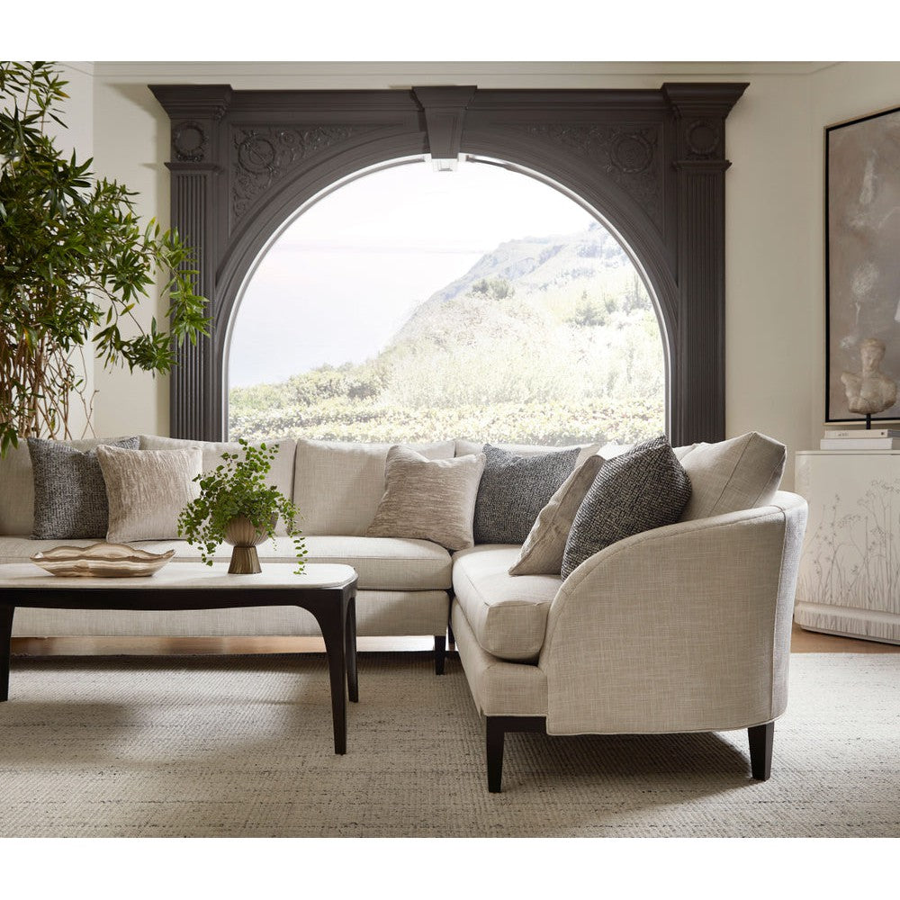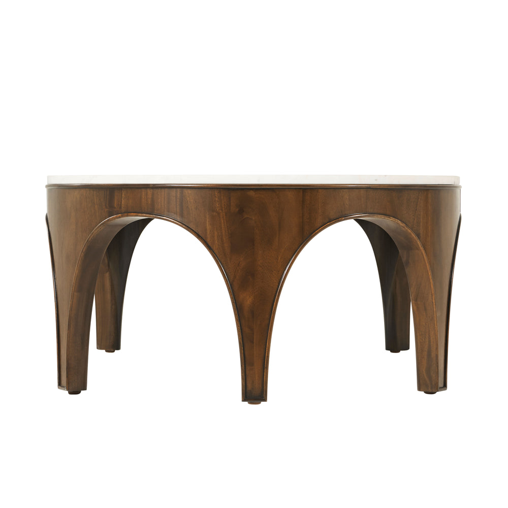 The Arlo Cocktail Table features a raised lip, highlighting the outline of the architectually inspired legs. This contemporary cocktail table, crafted from mahogany in our Gelato finish, boasts a light marble top that adds contrast.