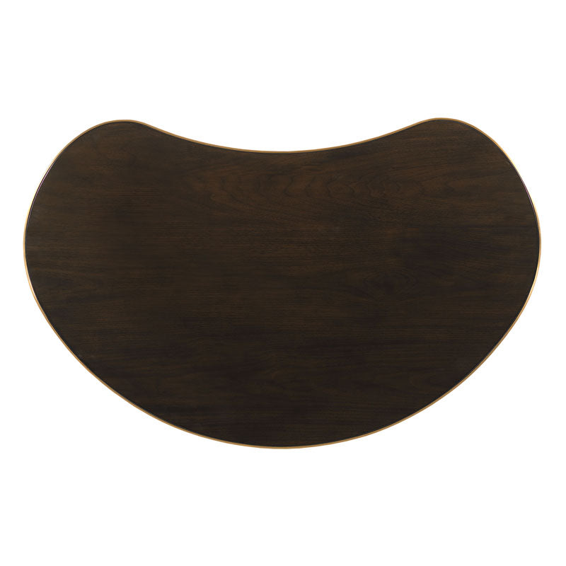 A curvaceous top is veneered with exotic Mozambique fitted into a brushed brass base elevated on four rectangular legs that are joined by a low X stretcher.