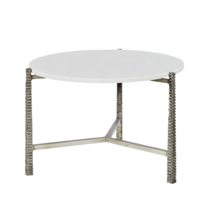 Round coffee table with Carrara marble top, three hand cast textured legs, smooth tri-shaped stretcher