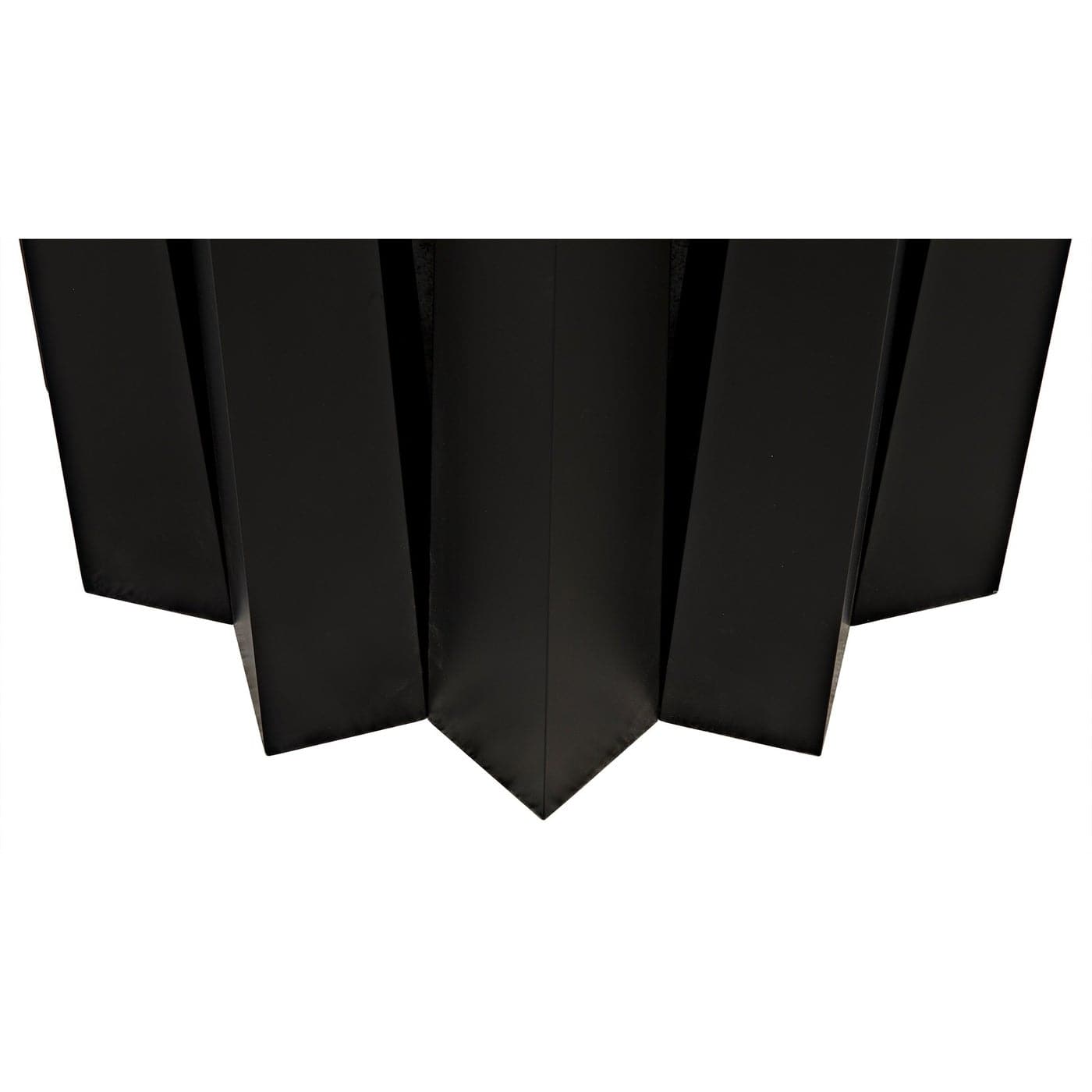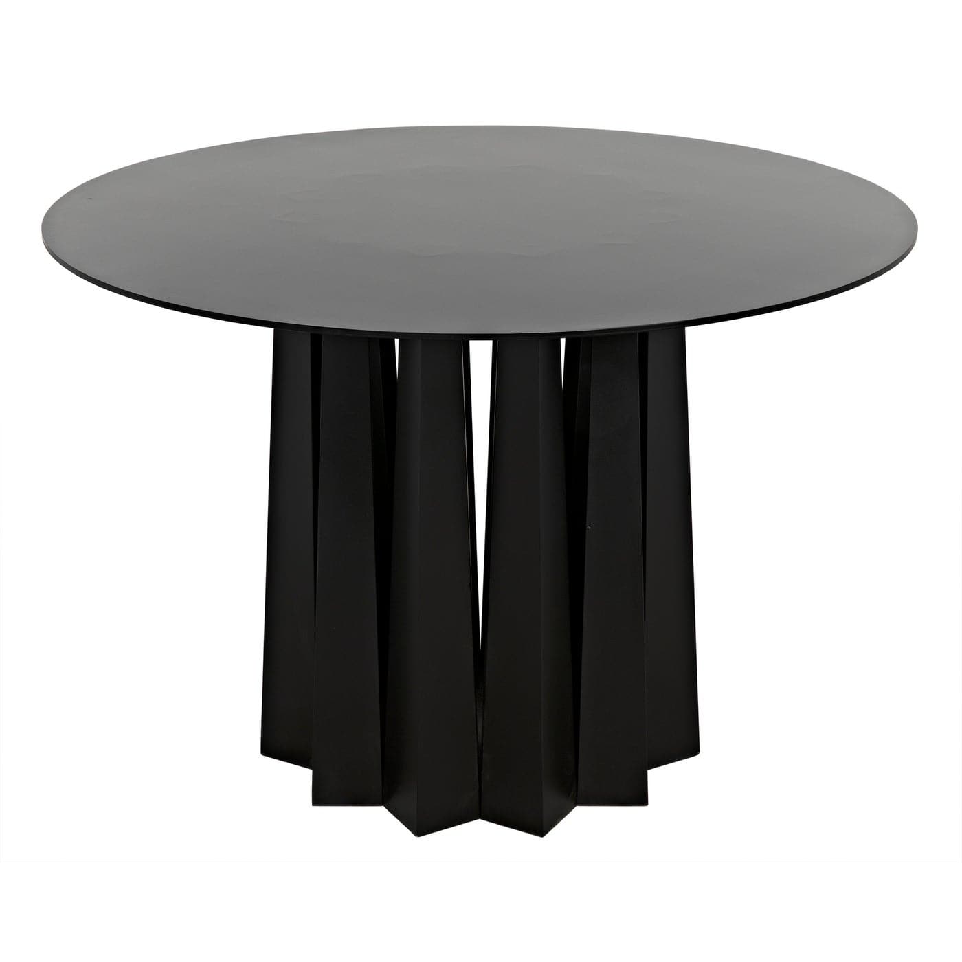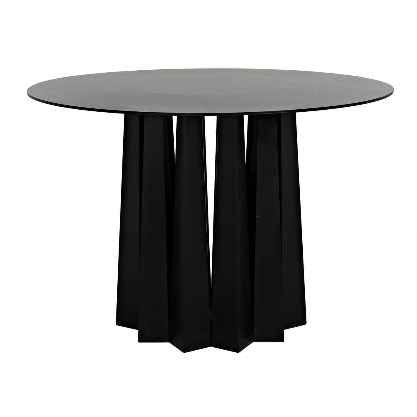 Black finished steel is fashioned into 44" dining table with multiple tapered square legs positioned to create a pleating effect.